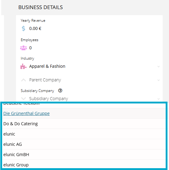 - Parent and subsidiary companies can be found under the "Company Data" category (both fields function in the same way).