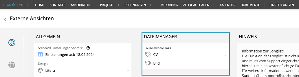 Under “Selectable Tags”, you specify which file categories the candidate can choose from when uploading a file.