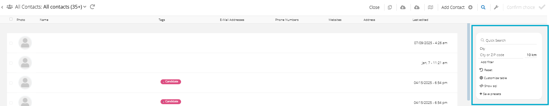 A pop-up will then open showing all existing contacts. Using the quick search on the right-hand side, you can easily find relevant recipients and add them to the campaign.