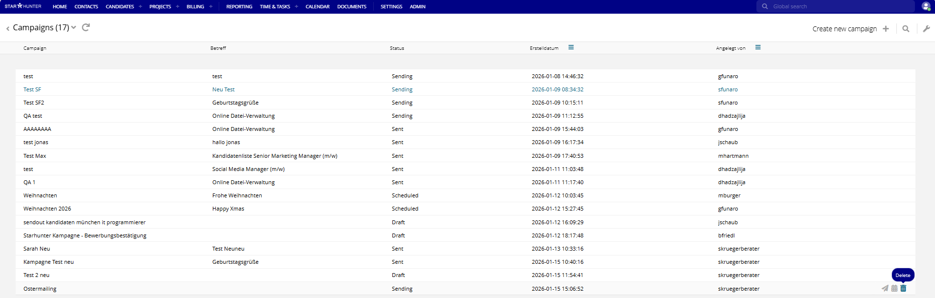 Note: Only campaigns that you created yourself can be deleted using the trash icon. For campaigns created by other users, this option is not available.