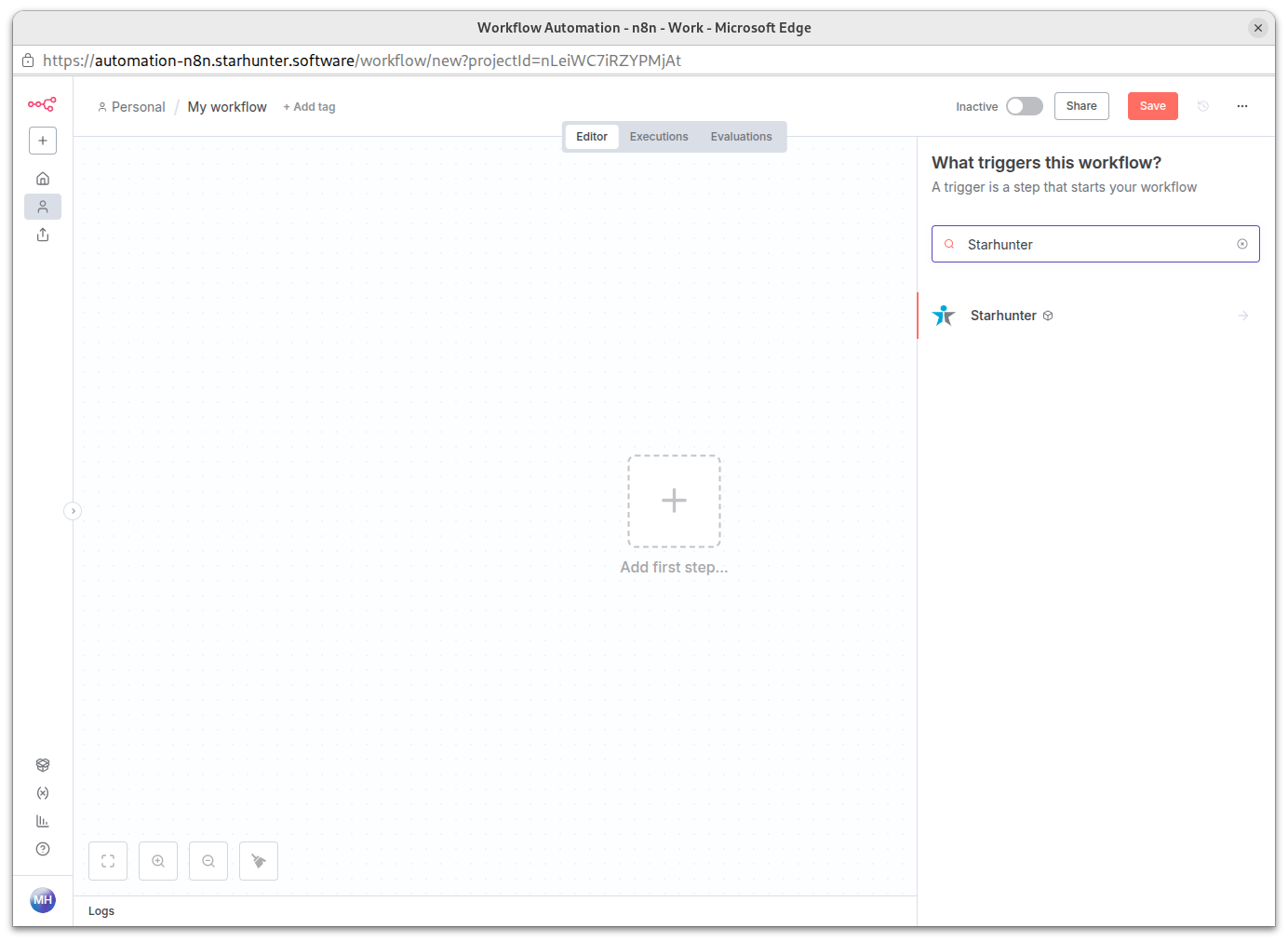 - Gehen Sie in n8n zu einem Workflow und fügen Sie einen Starhunter Node hinzu