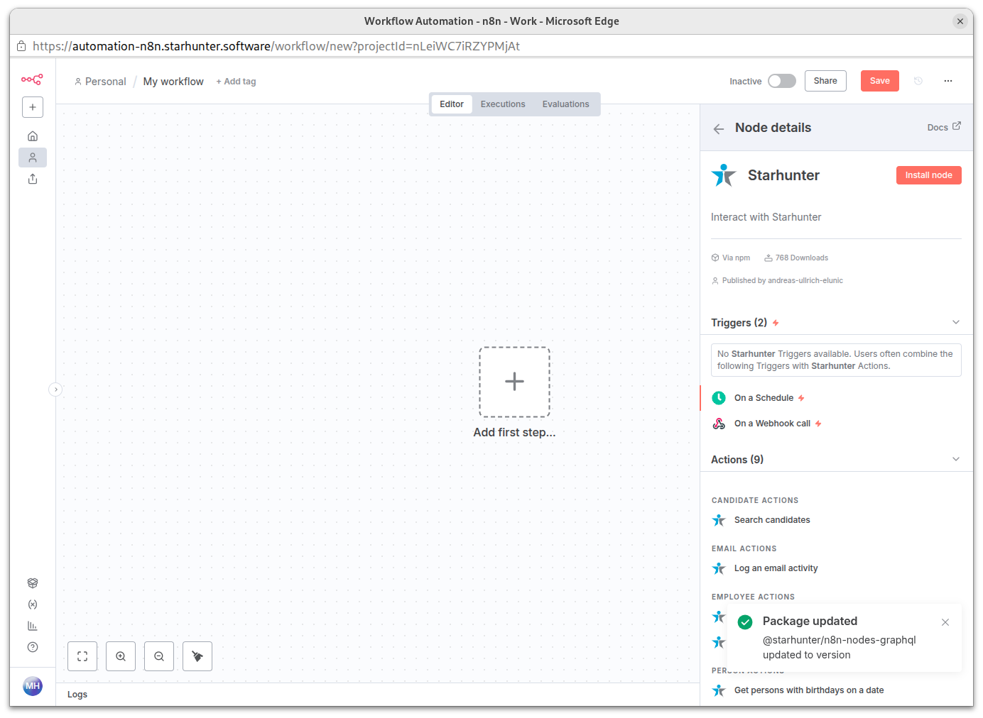 Der Starhunter Node ist als offizieller n8n Node verfügbar, muss aber einmalig installiert werden.