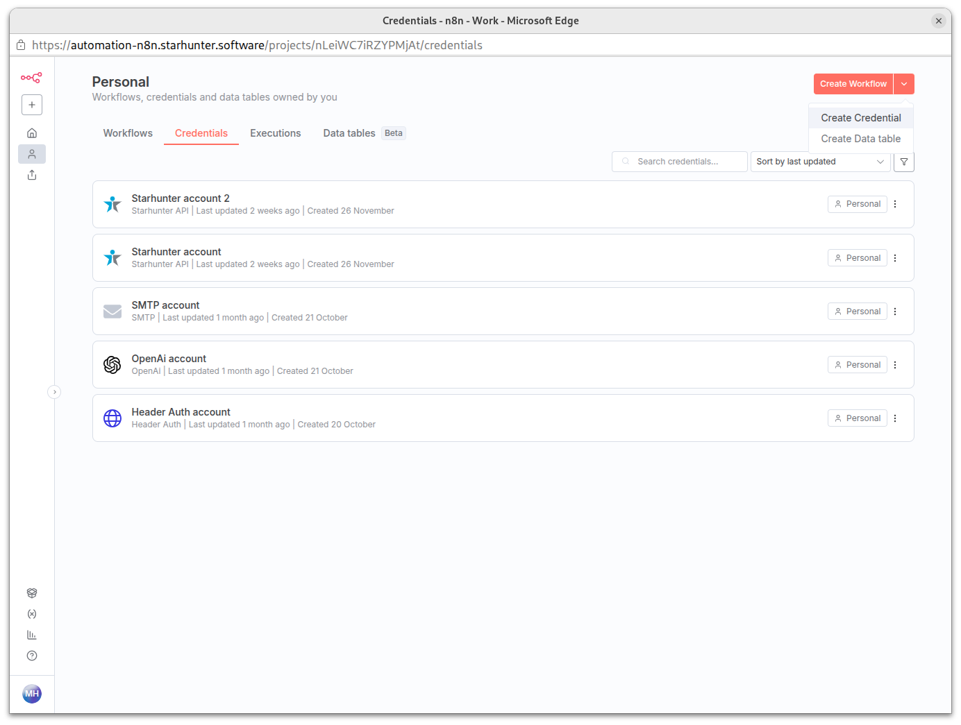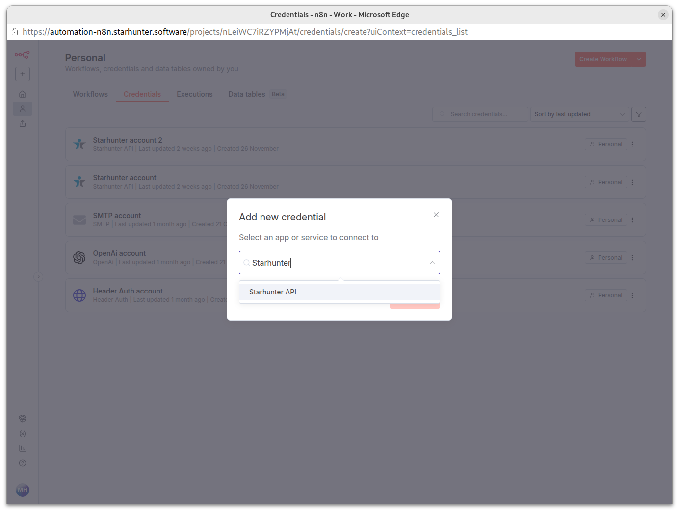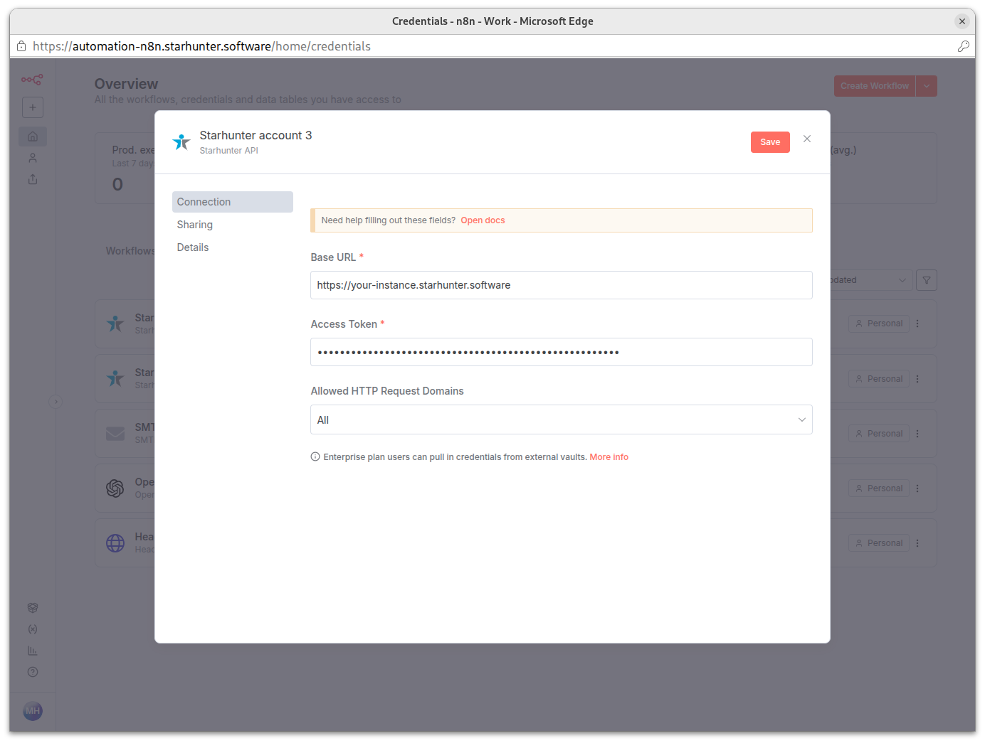 Jetzt verbinden Sie n8n mit Starhunter, indem Sie die API-Zugangsdaten (Credentials) hinterlegen.