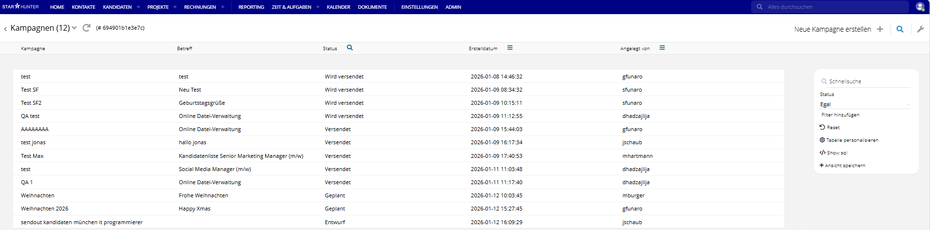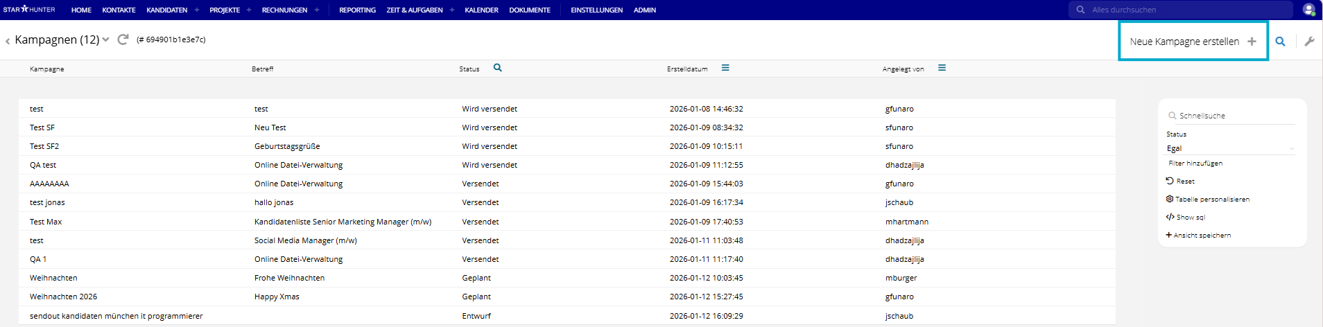 Alle bereits erstellten oder versendeten Kampagnen sind in der Kampagnenübersicht aufgeführt und können dort eingesehen und bearbeitet werden.