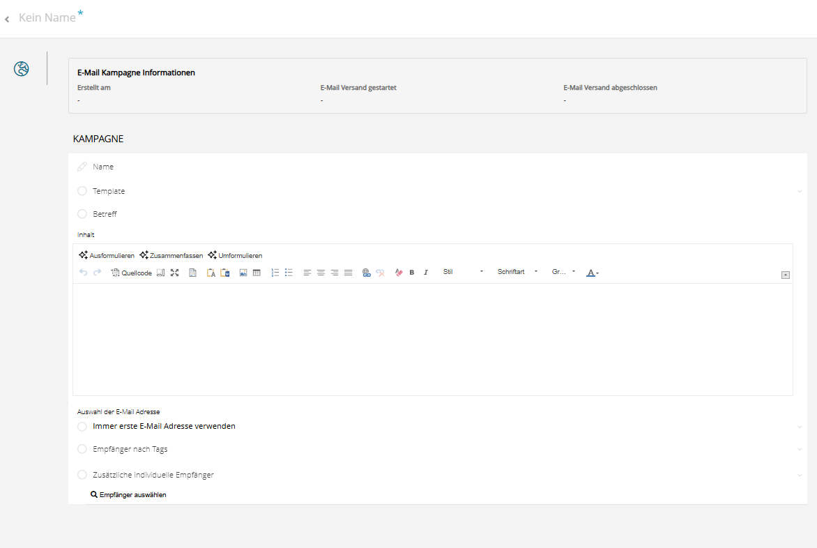 - Template: Der Inhalt des ausgewählten Templates wird in Betreff und Inhalt kopiert. Sie können beide Felder frei anpassen. Das ursprüngliche Template bleibt dabei unverändert und dient lediglich als Vorlage.