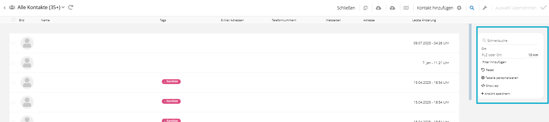 Daraufhin öffnet sich ein Pop-up mit allen angelegten Kontakten. Über die Schnellsuche auf der rechten Seite können Sie gezielt nach relevanten Empfängern suchen und diese bequem zur Kampagne hinzufügen.
